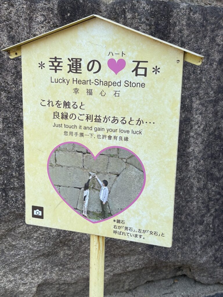 丸亀城の「幸運のハート石」は、大手第一門をくぐった先にある石垣の中(男石と女石の間)に見られるハート型に似た石で、良縁のご利益があるとされ、触れると幸運が訪れるといわれています。このハート石は立て看板で案内されており、ハート型の焼き菓子(はぁといしクッキー)も販売されるほど人気で、丸亀城観光の隠れた見所のスピリチュアルスポットのようです。